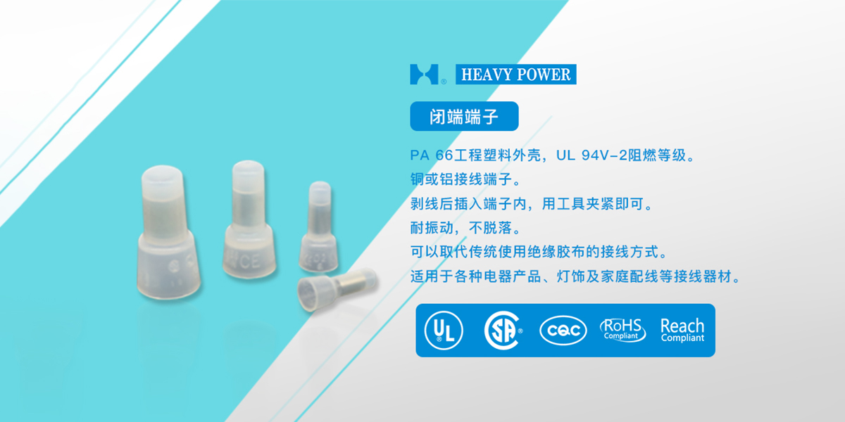 一、閉端端子特點1、PA 66工程塑料外殼,UL 94V-2阻燃等級。2.銅或鋁接線端子。3.剝線后插入端子內,用工具夾緊即可。4.耐振動,不脫落。5.可以取代傳統使用絕緣膠布的接線方式。6.適用于各種電器產品、燈飾及家庭配線等接線器材。