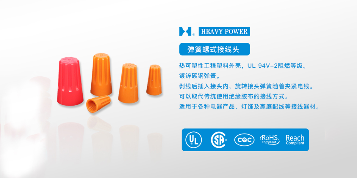 1.熱可塑性工程塑料成型外殼,UL 94V-2阻燃等級。2.鍍鋅碳鋼彈簧。3.電線剝線后插入接頭內,旋轉接頭,彈簧隨著夾緊電線。4.可以取代傳統使用絕緣膠布的接線方式。5.適用于各種電器產品、燈飾及家庭配線等接線器材。6.多色可選。
