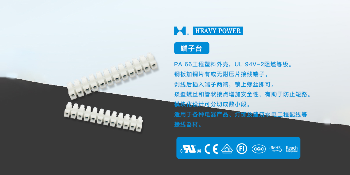 一、端子臺產品特點1.PA 66工程塑料外殼,UL 94V-2阻燃等級。2.鋼板加銅片有或無附壓片接線端子。3.剝線后插入端子兩端,鎖上螺絲即可。4.嵌壁螺絲和管狀接點增加安全性,有助于防止短路。5.模塊化設計可分切成數小段。6.適用于各種電器產品、燈飾及建筑水電工程配線等接線器...