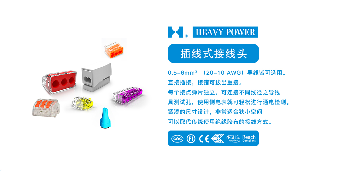 一、插線式接線頭產品特點1.0.5-6mm2(20-10 AWG)導線皆可選用。2.直接插接, 接錯可拔出重接。3.每個接點彈片獨立,可連接不同線徑之導線。4.具測試孔,使用側電表就可輕松進行通電檢測。5.緊湊的尺寸設計,非常適合狹小空間。6.可以取代傳統使用絕緣膠布的接線方式。